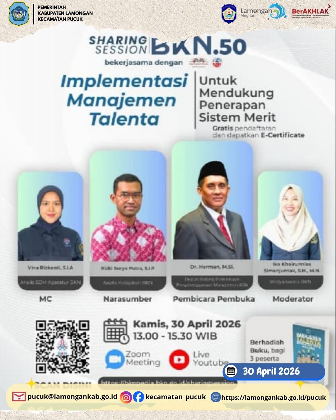 Dalam rangka meningkatkan kualitas sumber daya aparatur serta mendukung tata kelola pemerintahan yang profesional, Pemerintah Kecamatan Pucuk akan mengikuti kegiatan Webinar bertema “Implementasi Manajemen Talenta untuk Mendukung Penerapan Sistem Merit Tahun 2026”.